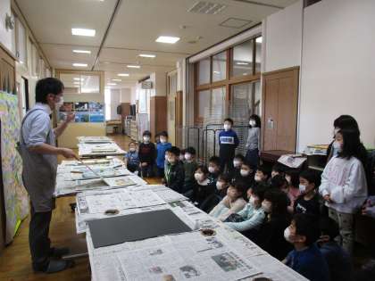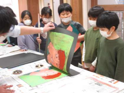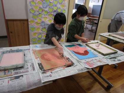 3年生 図工 公開日 2023/02/16 更新日 2023/02/16 3年生 ついに版画を刷りました。白い魔法の液体をローラーで塗ってバレンでこすると、黒画用紙にきれいに板の写すことができ、「おぉー」と歓声が上がりました。