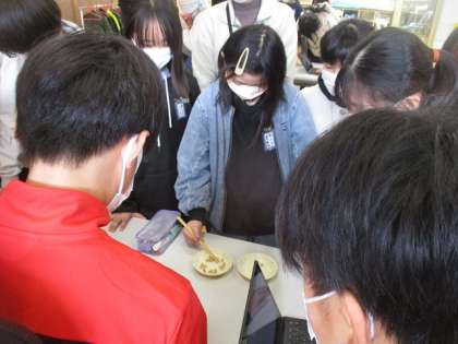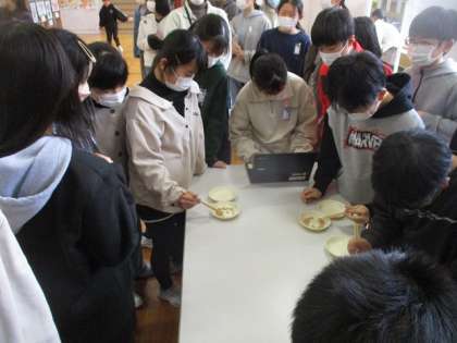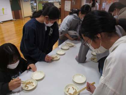 給食委員会主催の豆つかみ大会に参加しました。 正しい箸の持ち方に気をつけて真剣に臨んでいました。
