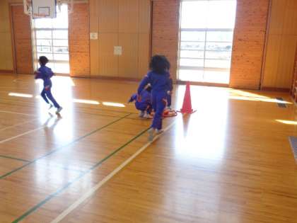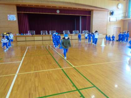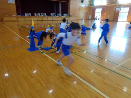 体育の学習で、走る運動をしました。いろいろな走り方をしたり、お手玉を自分の陣地により多く入れるというゲームをしたりしました。