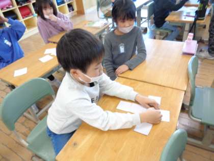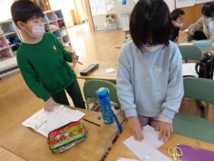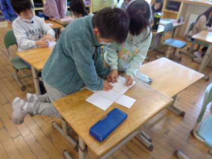 今日は、箱作りに挑戦しました。自分たちで切り取った四角形を立体にするために、ペアで協力して活動しました。