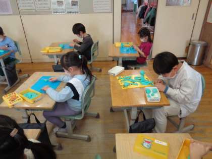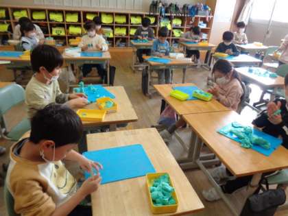 1年竹組 図画工作「いっしょにおさんぽ」 公開日 2023/03/08 更新日 2023/03/08 1年生 「だれと」「どこに」「どうやって」お散歩するのか考えて、粘土で作品をつくりました。うさぎと一緒に月に行ったり、アザラシと北極に行ったりと、自分の思いを表していました。