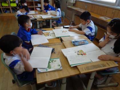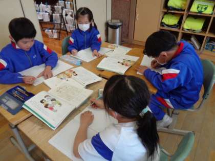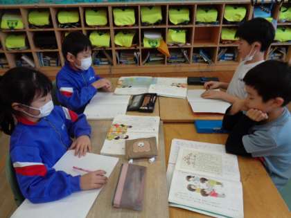 1年生になってから、嬉しかったこと、楽しかったこと、おどろいたこと、がんばったことをグループになって思い出しました。運動会、校外学習、ファミリー遠足、当番活動等たくさんの思い出していました。
