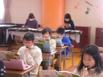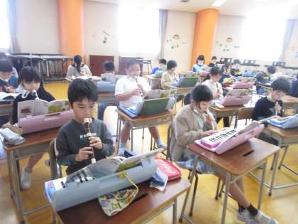 3年生 音楽 公開日 2023/03/15 更新日 2023/03/15 3年生 今日は、「エーデルワイス」をリコーダー1と2、鍵盤ハーモニカ、鉄琴の4つのパートに分かれて演奏しました。みんな、おうちでも練習を頑張っているおかげで、とてもきれいなハーモニーになりました。音が重なり合う美しさを感じ、演奏が終わった後、笑顔になる子供が多かったです。