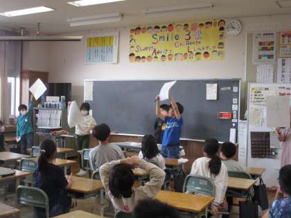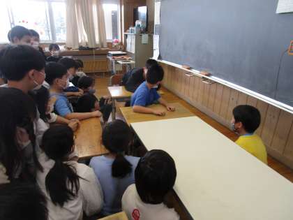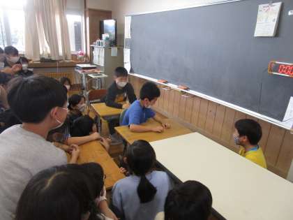 お笑い係のコントに、みんなで大爆笑した後は、班毎に「ファイブリーグ」を行いました。