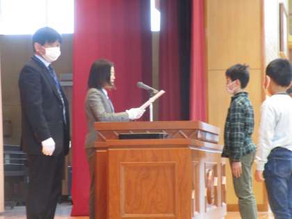 学年代表として選ばれた児童が、校長先生から直接修了証を受け取りました。代表の児童と心を繋げて、お辞儀をしていました。