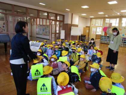 下校前に、オープンスペースでコース毎に分かれて並びました。初めての下校に、ドキドキしている様子でした。