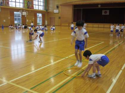 2年生の体育が始まりました。いろいろな動きをして、楽しみました。
