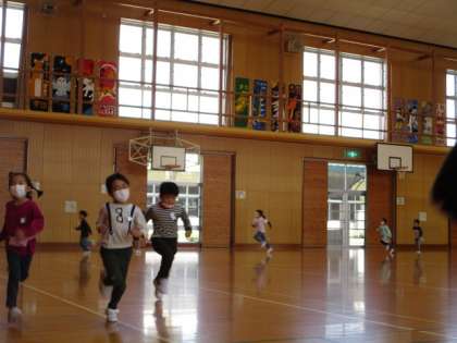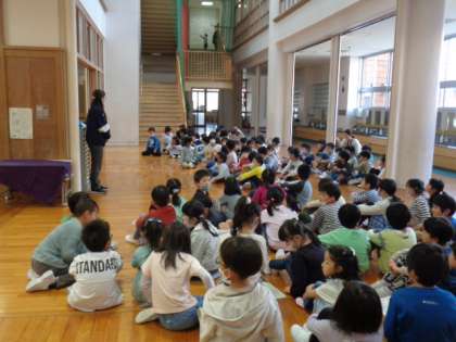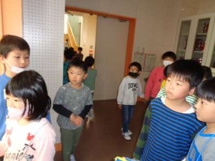 2年生のお兄さん・お姉さんと手をつないで、学校の中を探検しました。体育館や音楽室等のいろんな教室があって、わくわくしながら探検できました。
