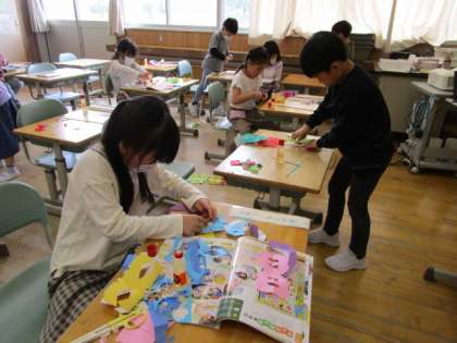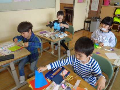折り紙を折ったり重ねたりしてはさみできってみました。すてきな模様やおもしろい模様ができました。どんな形になるのかわくわくしながら活動しました。