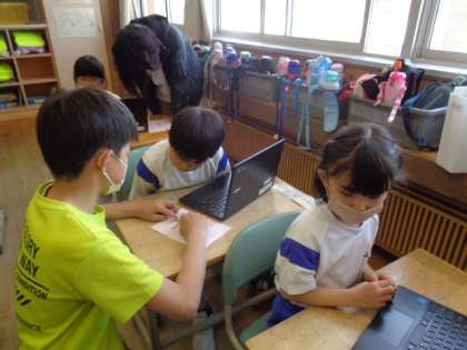 1年生 クロムブック 公開日 2023/04/27 更新日 2023/04/27 1年生 学校や家庭でクロムブックが使えるように、6年生のお兄さん・お姉さんに教えてもらいながら、パスワードの入力を行いました。画面下にある黒板のアイコンを触ると、クラスルームに入れることを学びました。 今週末には、家庭に持ち帰ります。自分でパスワードの入力ができるといいですね。