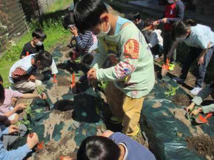 2年生 生活科「やさいをそだてよう」 公開日 2023/05/09 更新日 2023/05/09 2年生 2学期に「サツマイモパーティ」を予定しています。今日は「大きなサツマイモがたくさんとれますように」と願いを込めて、苗を植えました。バケツに中に入れていたら、白いかわいい根がもう出ていました。どんぶりくらいの穴をあけ、船底のように寝かせたり斜めに置いたりして 丁寧に植えました。