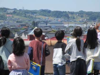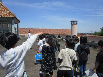 学校の屋上に行き、東西南北の様子を見学し、ワークシートに記入しました。