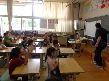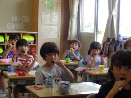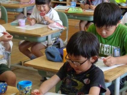 6歳きゅう歯が生えてくる時期になり、「きれいにはをみがくには、どうしたらよいのかな」を学習しました。きれいに歯を磨いているつもりでも、染め出し錠を使って汚れを確認すると、「前歯の先」や「奥歯のみぞ」が赤く染まってました。子供たちの振り返りには、「奥歯のでこぼこをちゃんと磨きたい」「歯と歯茎の間を気を付けて磨きたい」と書いてありました。