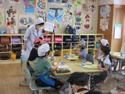学校栄養職員の先生が給食の時間に、献立について詳しく紹介してくださいました。毎回、子供たちは楽しみにしています。