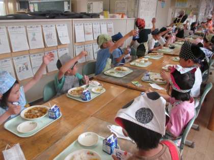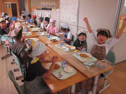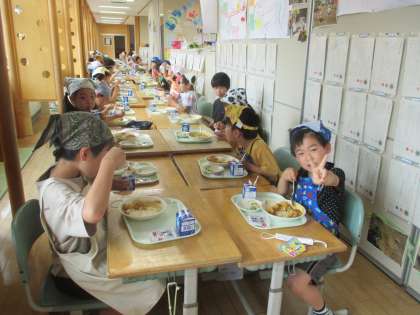 2年生 みんなでなかよし給食 公開日 2023/06/19 更新日 2023/06/19 2年生 今日は、松組と竹組と一緒に食べました。みんなで給食主催の主催の「食べキリン レース」に挑戦します。今日は、カレーライスの日だったので、みんな食べきることができました。