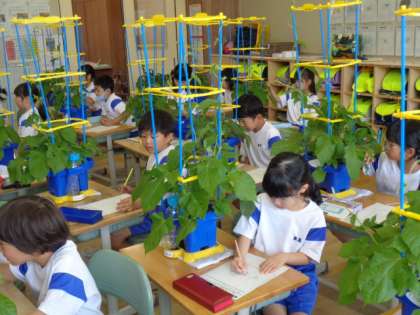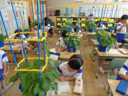 1年竹組 生活科 公開日 2023/06/20 更新日 2023/06/20 1年生 朝顔の観察カードを書きました。葉っぱが自分の手や顔より大きくなっているや支柱のてっぺんまで来ていることに驚いていました。水をあげるお世話を続けてきたからだなと感じていました。