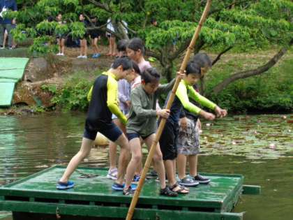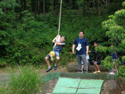 4年生 宿泊学習(呉羽青少年自然の家)3 公開日 2023/06/23 更新日 2023/06/23 4年生 ざりがに釣りの後は、池遊びを行いました。いかだ遊び、池ジャングル、ターザンロープに順番に取り組み、体を使って自然に親しみました。