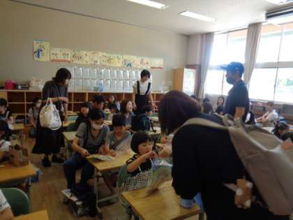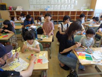 学級役員の方々が計画してくださった「うちわづくり」と「学校探検クイズラリー」が行われました。親子で相談して、海の様子のうちわやお花畑のうちわ等、素敵なうちわができました。
