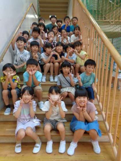 夏休みが終わり、教室に子供たちの笑顔があふれていました。全員そろいました。 2学期もがんばるぞ。