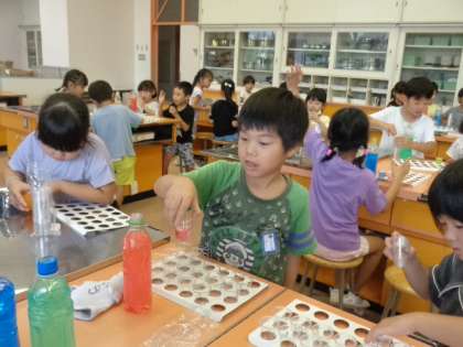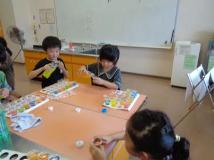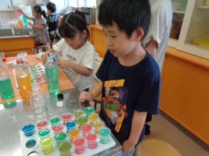 5色の色水を使って、「カラフルいろみず」の学習をしました。色を混ぜたり、濃さを変えたりして色の変化を楽しみました。