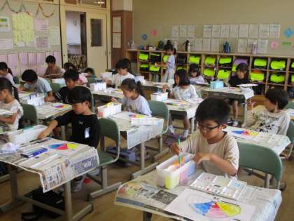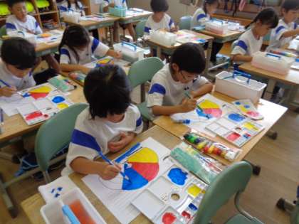 1年生 図画工作科 水彩絵の具となかよし 公開日 2023/10/04 更新日 2023/10/04 1年生 筆洗の使い方や絵の具の使い方など、水彩道具の基本的な使い方を学びました。今後、絵を描く学習で使っていきたいです。