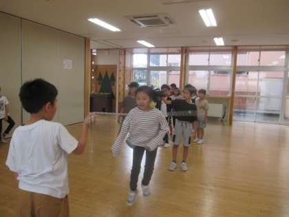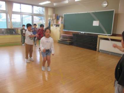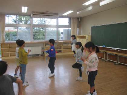 2年生 雨の日マイタイム 公開日 2023/10/10 更新日 2023/10/10 2年生 10月は、マラソンの練習に取り組みますが、今日のようにグラウンドが使えない日は、多目的教室や仲良しルームで、縄跳びに取り組んでいます。8の字跳びや単縄跳びなど、楽しく飛んでいます。楽しく跳んで います。。