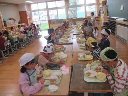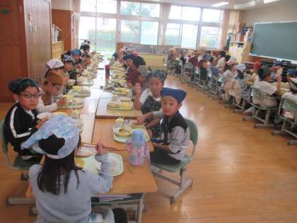 2年生の給食は、松組と竹組が一緒になって、仲良しルームで賑やかに食べています。楽しい話が尽きず、「クイズ」や「挨拶名人の紹介」に一喜一憂しながら、楽しく食べています。残食も少なく「食べキリン」を達成する日が大変多いです。