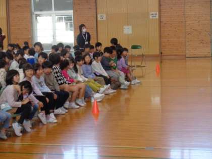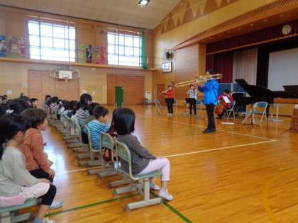 チェロ、バイオリン、フルート、トロンボーン、ピアノの素敵な演奏を聴きました。また、この5つの楽器の音の出し方を教えていただきました。子供たちは聞き覚えのある曲では、「この曲知っている。」とにこにこ笑顔で聴いていました。