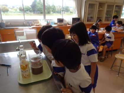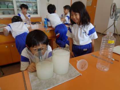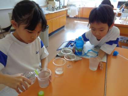 ペットボトルに入ったジュースを同じ大きさの入れ物に入れて比べました。太いから多く入ると思っていた子供たちは、同じ量だったので、驚いていました。