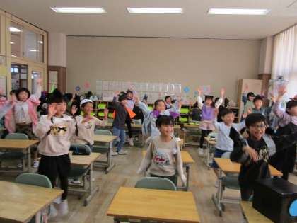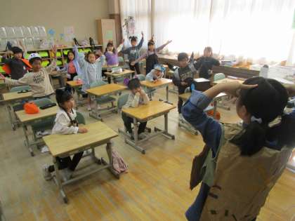 1年松組 ハロウィンパーティー その3 公開日 2023/10/31 更新日 2023/10/31 1年生 本係がみんなに人気のある本のクイズを出した後は、みんなで「3時のおやつ」をハロウィンバージョンにして楽しんだり、「ゾンビデダンス」を踊ったりしました。