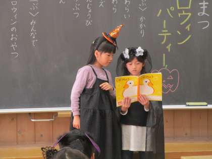 1年松組 ハロウィンパーティー その3 公開日 2023/10/31 更新日 2023/10/31 1年生 本係がみんなに人気のある本のクイズを出した後は、みんなで「3時のおやつ」をハロウィンバージョンにして楽しんだり、「ゾンビデダンス」を踊ったりしました。