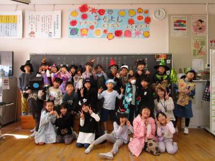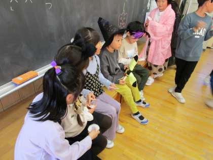 1年松組 ハロウィンパーティー その4 公開日 2023/10/31 更新日 2023/10/31 1年生 最後に、有志で準備をした「ハロウィンくじ」や、「ハロウィン見つけ」をみんなで楽しみました。たくさんの笑顔があふれる時間になりました。
