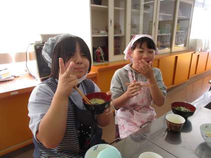 5年生 ご飯と味噌汁〜杉原のお米をおいしく頂こう〜2 公開日 2023/11/09 更新日 2023/11/09 5年生 ご飯はもちもちしていてとても美味しく、新米のよさを味わうことができました。味噌汁は、各班で食材を持ち寄り、オリジナリティー溢れる味噌汁ができあがりました。「煮干しはカルシウム!食品ロス撲滅!」と食べる子供も。