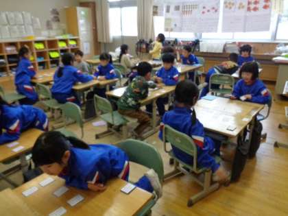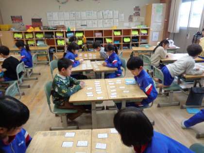 1年竹組 百人一首大会練習 公開日 2023/12/21 更新日 2023/12/21 1年生 1月になると、ファミリー対抗の百人一首大会があります。教室で練習しました。カルタには下の句しか書いてないので、なかなか取れず悔しがっている子供たちでした。冬休みにご家庭で練習すると楽しいですね。