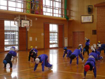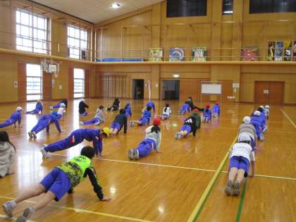 怪我のないよう、まずはウォーミングアップです。手のひらをしっかりとついて、腕の力を使う練習です。