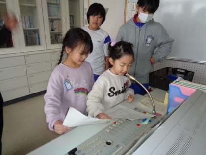 校内放送の体験をしました。自分たちで「なぞなぞ」を調べて、休み時間に読む練習をしました。本番では、すらすらと放送原稿を読むことができました。