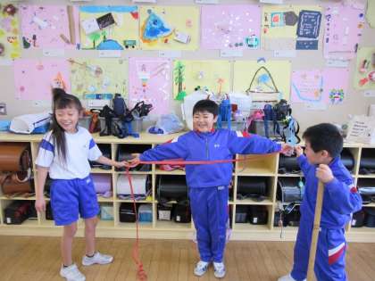 「ひろ」の長さを測りました。紙テープに長さを写し取り、竹ものさしを使って話し合いながら活動に取り組んでいました。