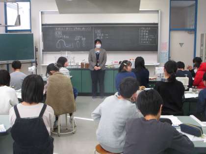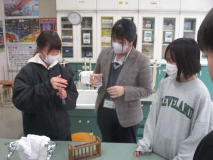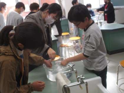 中学校の先生に理科の授業をしていただきました。炭酸水にとけている物の正体を突き止めようと、班の仲間と協力して楽しく実験に取り組んでいました。