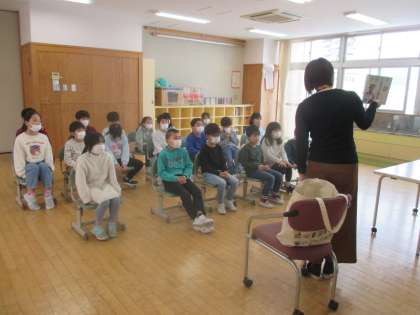 富山八尾八尾図書館ほんの森から、司書の方々に来ていただき、いろいろな本を紹介していただきました。松組で紹介された本のテーマは「夜」、竹組では「カレーライス」をテーマに楽しく読み聞かせをしていただきました。休み時間になると、早速手に取り楽しそうに読む姿が見られました。