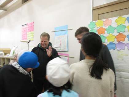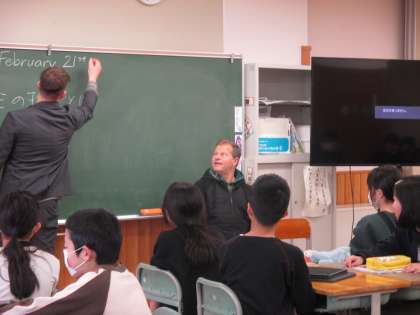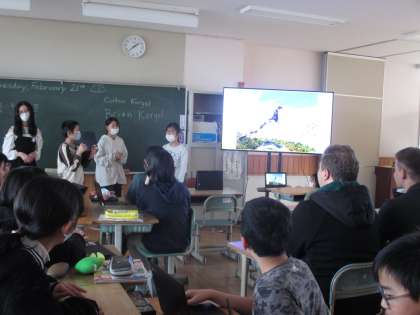 コルトン先生のお父さんのブライアンさんと特別レッスンをしました。おわら、黒部ダム、ますの寿司、氷見の寒ブリなどグループごとに英語で伝えました。どれも初めての情報だったようで、大変興味を持って聞いておられました。英語で質問もしました。好きな教科や、どんなお仕事をしておられるか、など今まで習った英語でもたくさん尋ねることが出来ることがわかりました。アメリカの大学で「科学エンジニアリング」を教えておられるということで、「何だろう?」「もっと詳しく知りたいな〜」と興味津々の5年生でした。