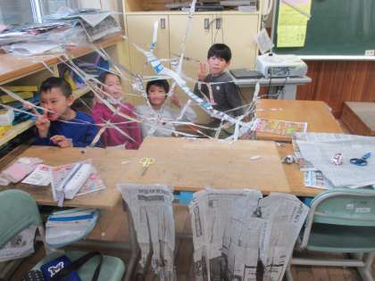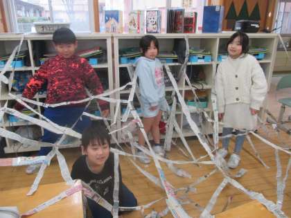 2年生 図画工作科「つないで つるして」 公開日 2024/02/22 更新日 2024/02/22 2年生 図画工作科の時間に、細長い紙をつないだりつるしたりして、グループで作品作りを楽しみました。「たてにいくつもつりさげよう」「下はゆるめてつなごう」「下にトンネルができたよ」など、相談しながらつないだり作った場所を探検したりしました。