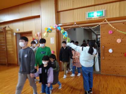 卒業を祝う会が行われました。1年生は6年生に一番お世話になっていると感じている子供たちです。ファミリー班のキャプテンと手をつないで入場しました。