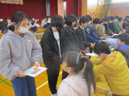 6年生 卒業を祝う会3 公開日 2024/03/02 更新日 2024/03/02 6年生 1年生とはにらめっこや腕相撲、縄跳びで代表者と対決を行いました。 5年生からは、6年生の良さを劇でまとめて披露してくれました。 そして最後には、ファミリーのメンバーで作ったオリジナルのアルバムを1人1人プレゼントしてもらいました。