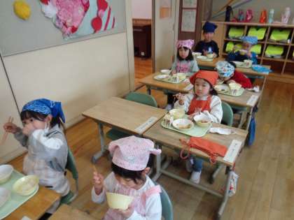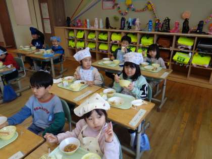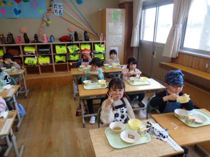 給食当番を中心に配膳を進め、自分の食べられる量をとりおいしそうに食べていました。