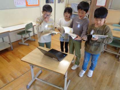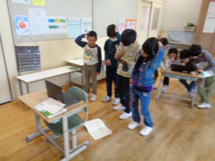 谷川俊太郎の詩「どきん」の「つるつる」や「そよそよ」を自分たちが表現したいように、体を使って表していました。