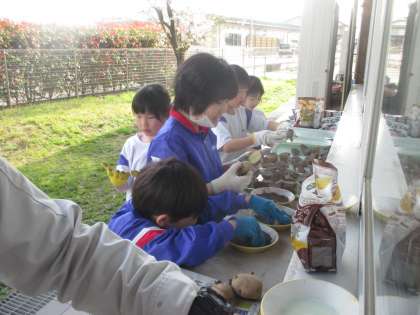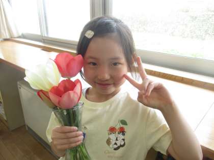 朝のマイタイムに、明日植えるジャガイモの準備を、用務員さんと一緒に行いました。また、おうちから、とても綺麗なチューリップを持ってきてくれた子供もいました。教室からは桜が見え、昨日子供たちが描いた「おはなみスケッチ」の絵もあり、すっかり春がいっぱいの教室です。