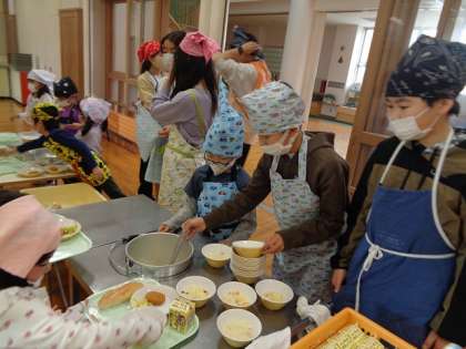 6年生 給食サポート 公開日 2024/04/11 更新日 2024/04/11 6年生 1年生さんがスムーズに給食の配膳ができるようにサポートをしています。食器を置く位置や盛りつける量をアドバイスするなど頼りになる姿を見せてくれました。