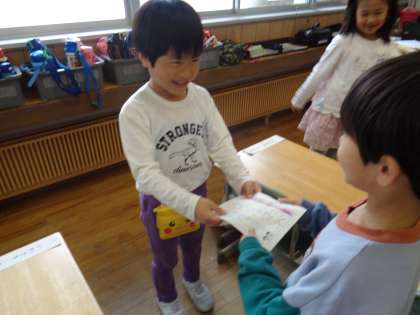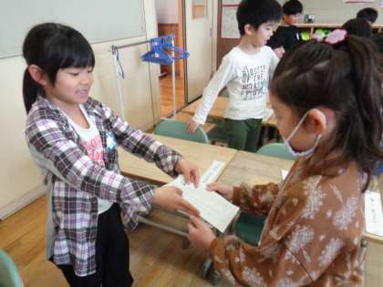 鉛筆の持ち方に気を付けて、自分の名前を丁寧に書き、友だちに「よろしくお願いします」とカードを交換しました。