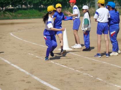 バトンを渡すタイミングや走り出すタイミングに気をつけながらバトンパスの練習に何度も取り組んでいました。