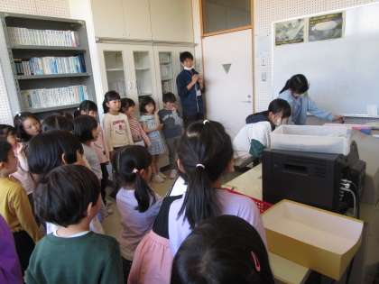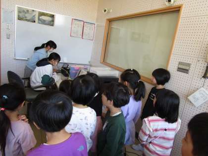 「実際に放送している様子を見たい!」と放送室へ見学に行きました。「毎日流れる校歌は、クロムブックから流れていたんだ」「レバーを上げると話し始めていたよ」等、様々な発見があったようです。